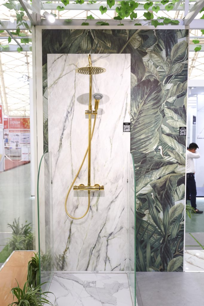 – Không gian Phòng tắm & Spa: Sự sang trọng được kết hợp giữa tấm đá nung kết vân đá cẩm thạch và vách tường ốp đá in họa tiết nhiệt đới, tạo nên cảm giác thư giãn, đẳng cấp như trong các resort 5 sao. Trải nghiệm tại đây giúp khách tham quan hình dung rõ nét về khả năng chống thấm, chống ẩm và tính thẩm mỹ vượt trội của vật liệu trong môi trường ẩm ướt.