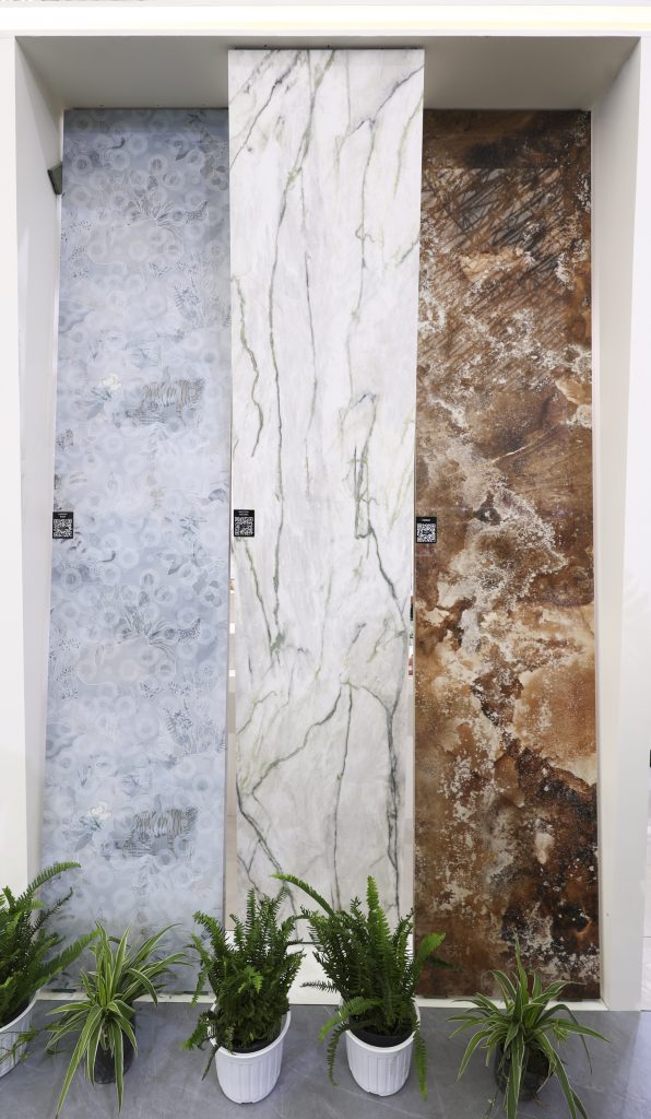Điểm nhấn đầu tiên thu hút mọi ánh nhìn là ngay khu vực sảnh đón tiếp, nơi sự hoành tráng của các tấm đá nung kết khổ lớn được kết hợp hài hòa với thiết kế ấn tượng và hệ thống cây xanh, tạo nên một tổng thể vừa hiện đại, sang trọng, vừa gần gũi với thiên nhiên. Các bảng thông tin lớn được bố trí trực quan, cung cấp cái nhìn tổng quan về quy mô, công nghệ sản xuất và cam kết phát triển bền vững của thương hiệu.
